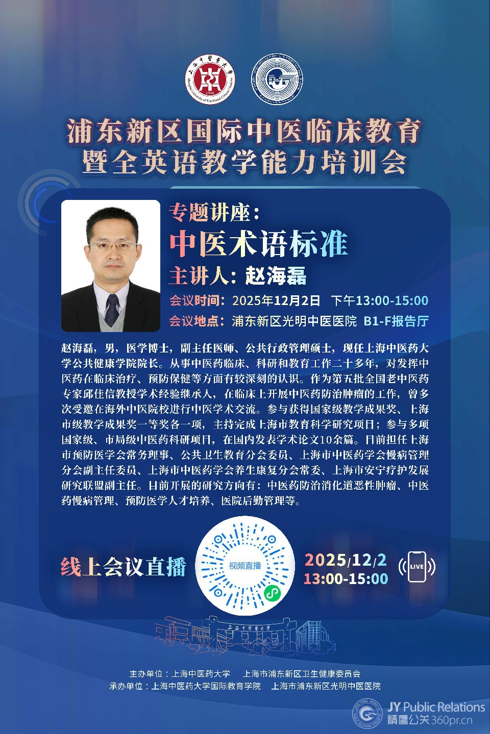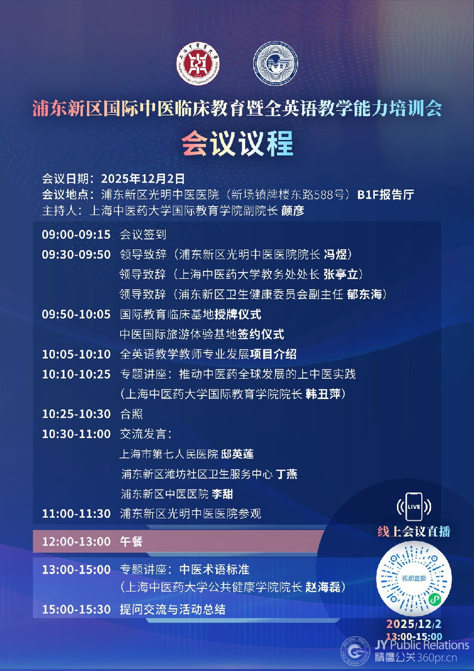 浦东新区国际中医临床教育暨全英语教学能力培训会 浦东新区国际中医临床教育暨全英语教学能力培训会举办时间:2025年12月2日 举办地点:浦东新区光明中医医院新场园区 B1F报告厅主办单位:上海中医药大学会务一站式服务机构:精一公关策划(上海)有限公司 021-51698540